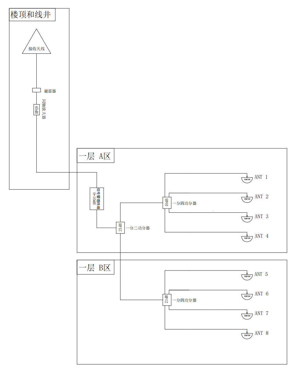 主要设备机架增益控制器放在一层 A 区,对天线下来信号进行增益控制放大,输出给一个一分二功分器,把信号分成两路,一路输出给 A 区,一路输出通过线缆,输出到另一个区域。