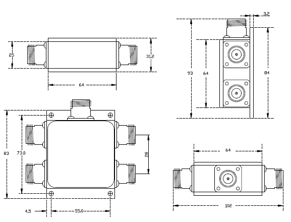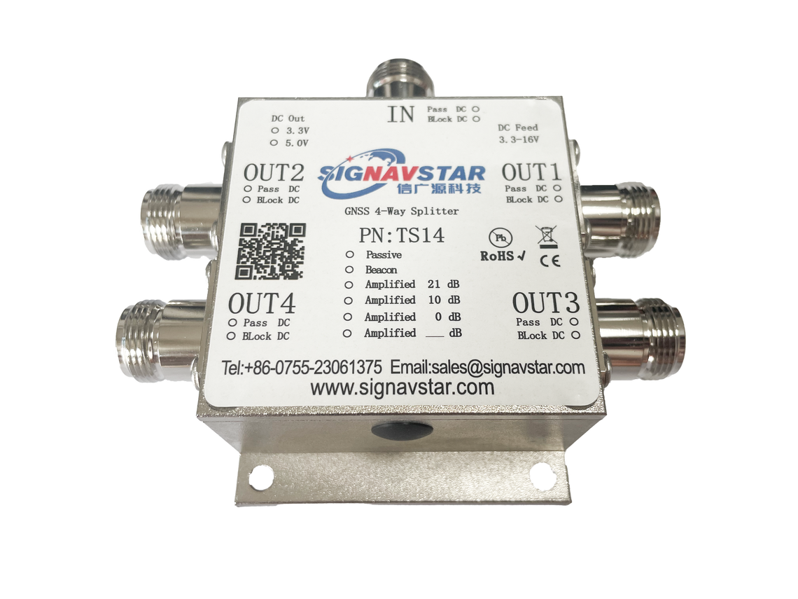 TS14是一款一路输入,四路输出的有源功分器,可以把一路GNSS信号分为四路GNSS信号,具有端口隔离度高、端口之间互不影响、自身对信号有增强的特点。