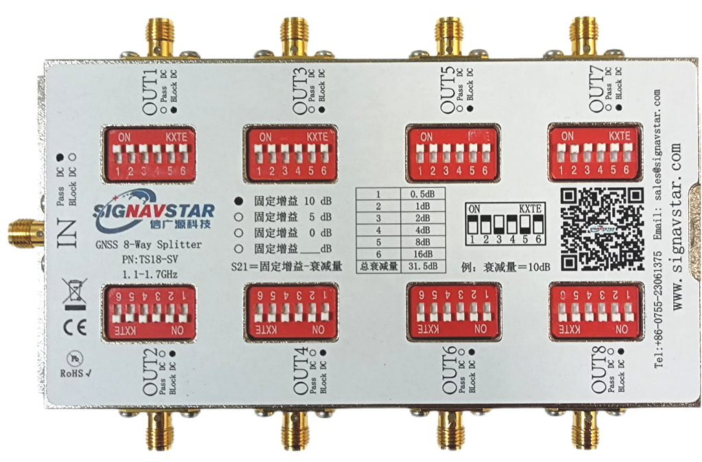 TS18-SV为一端输入,八端输出的GNSS信号转发功分设备,每路输出增益单独可调,0.5dB步进。